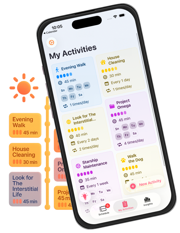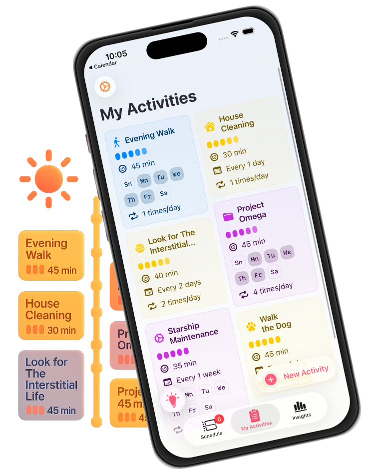 Rise understands natural language, so you can describe a task the way you’d say it out loud. Just type or dictate what you want to add, and Rise turns it into a structured activity with the right schedule — fast, intuitive, and effortless.