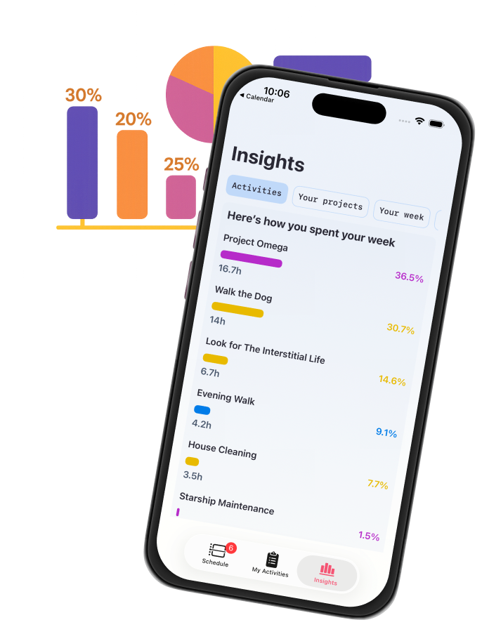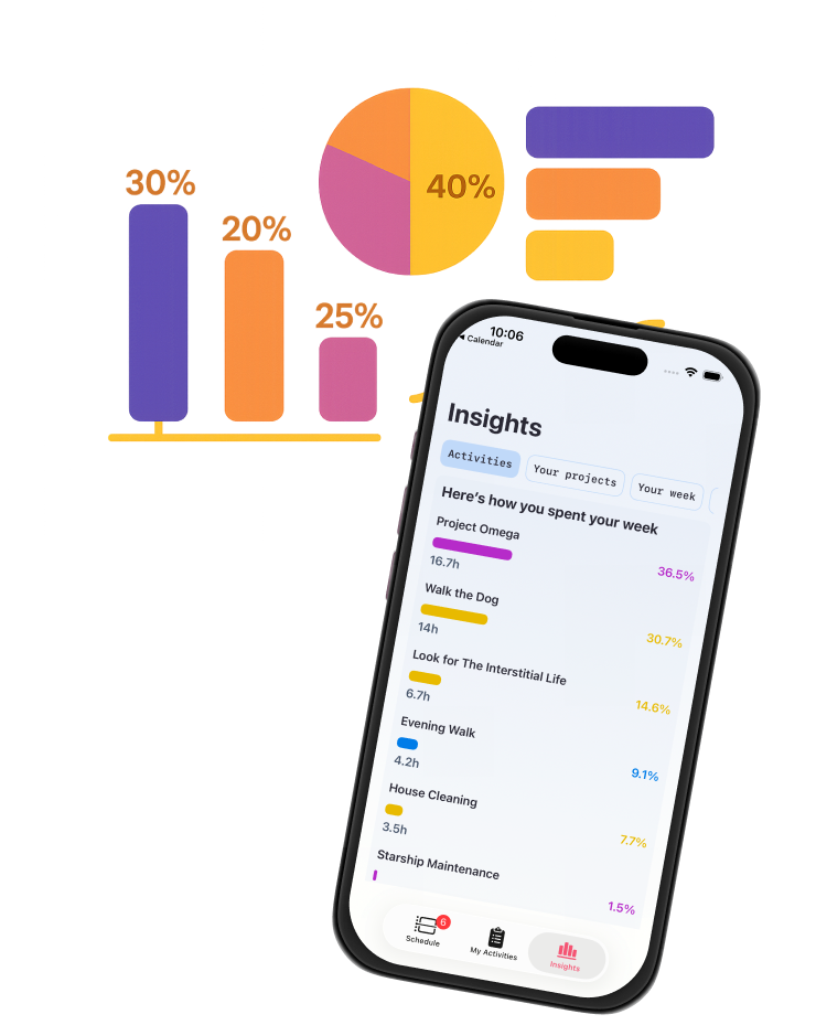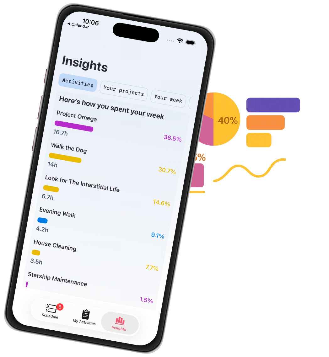 Rise breaks down how you spend your time across work, habits, and personal projects. Clear insights help you understand your patterns, spot bottlenecks, and make small adjustments that keep your schedule balanced and intentional.